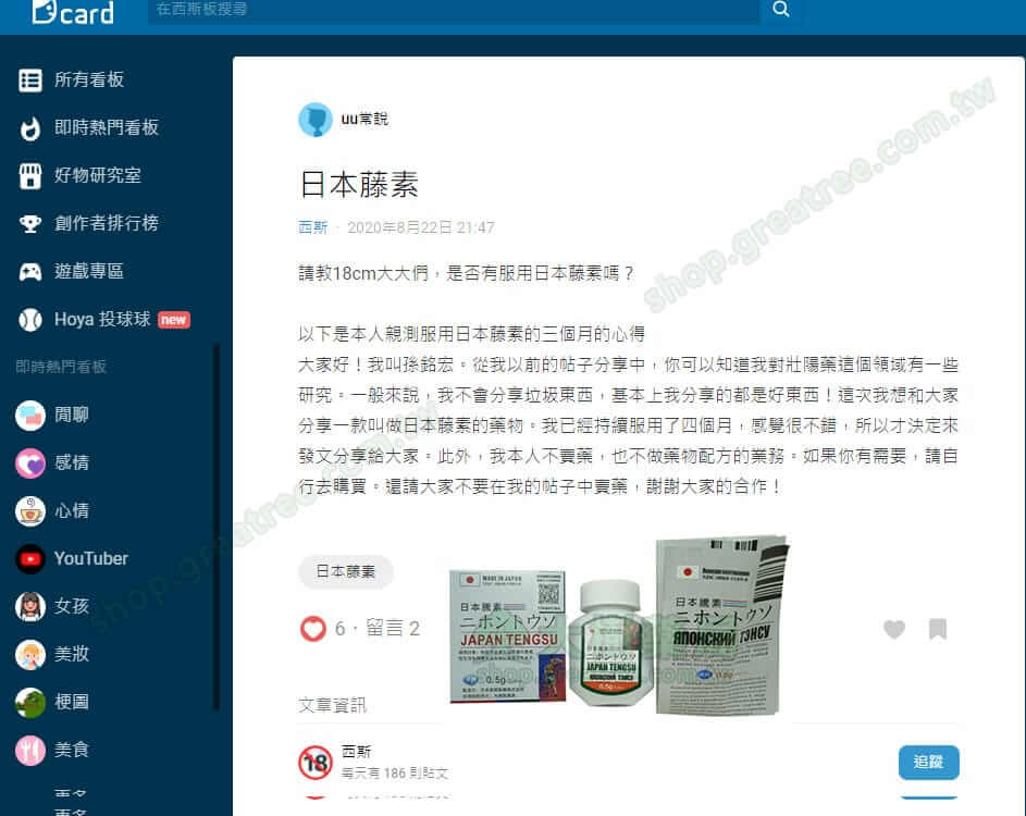 日本藤素是一種保養類的壯陽藥品,據說可以幫助民眾治療陽痿、早洩以及增大陰莖等功效。對於是否有人吃過日本藤素,這是一個很常見的問題。如果你想要找到答案,可以去日本藤素官方藥局(https://greatree.tw)上查找相關日本藤素資訊。在那裡,藥師有詳細解答...