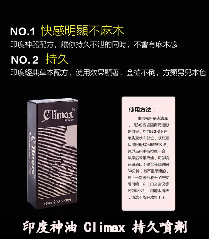 - 是否有長期使用風險? Climax 持久噴劑的天然成分確保了長期使用的安全性,無副作用,您可以放心長期使用。