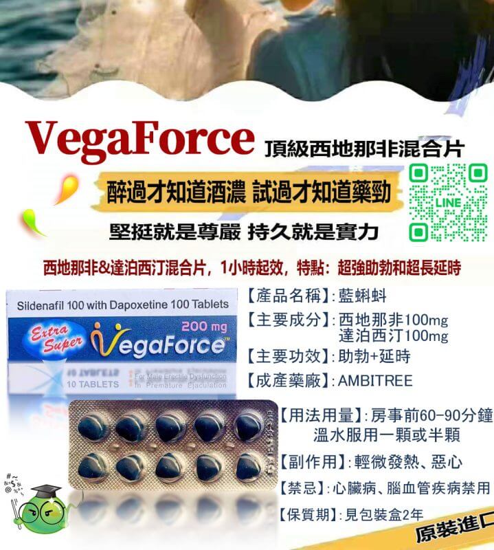 印度藍蝌蚪 VegaForce 由印度知名藥廠嚴格研發生產,是結合 助勃(西地那非 Sildenafil)延時(達泊西汀 Dapoxetine) 兩大功效的雙效型口服壯陽藥。